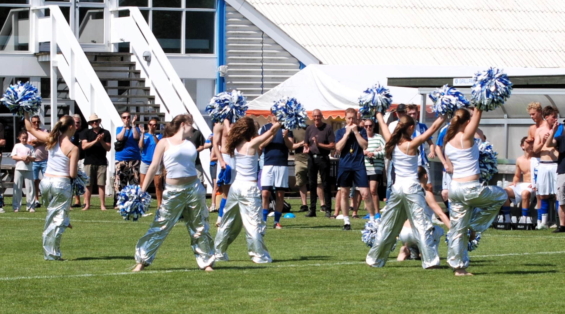 Der var fest og farver i Hornbæk på fodboldsæsonens sidste spilledag. Foreningens dygtige Cheerleaders var bare et af mange festlige indslag. Foto: Susanne Prahl.