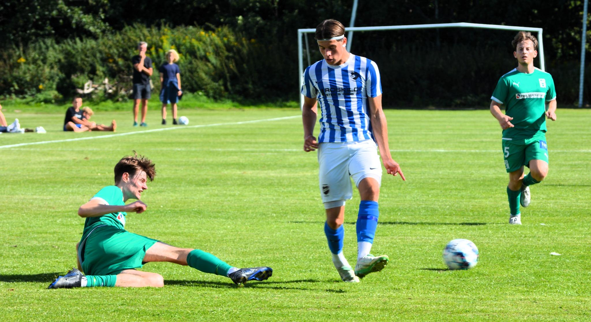 Marius Hesselholt, i blåhvid trøje, scorede Hornbæks første mål mod Frederikssund. Arkivfoto: Susanne Prahl.
