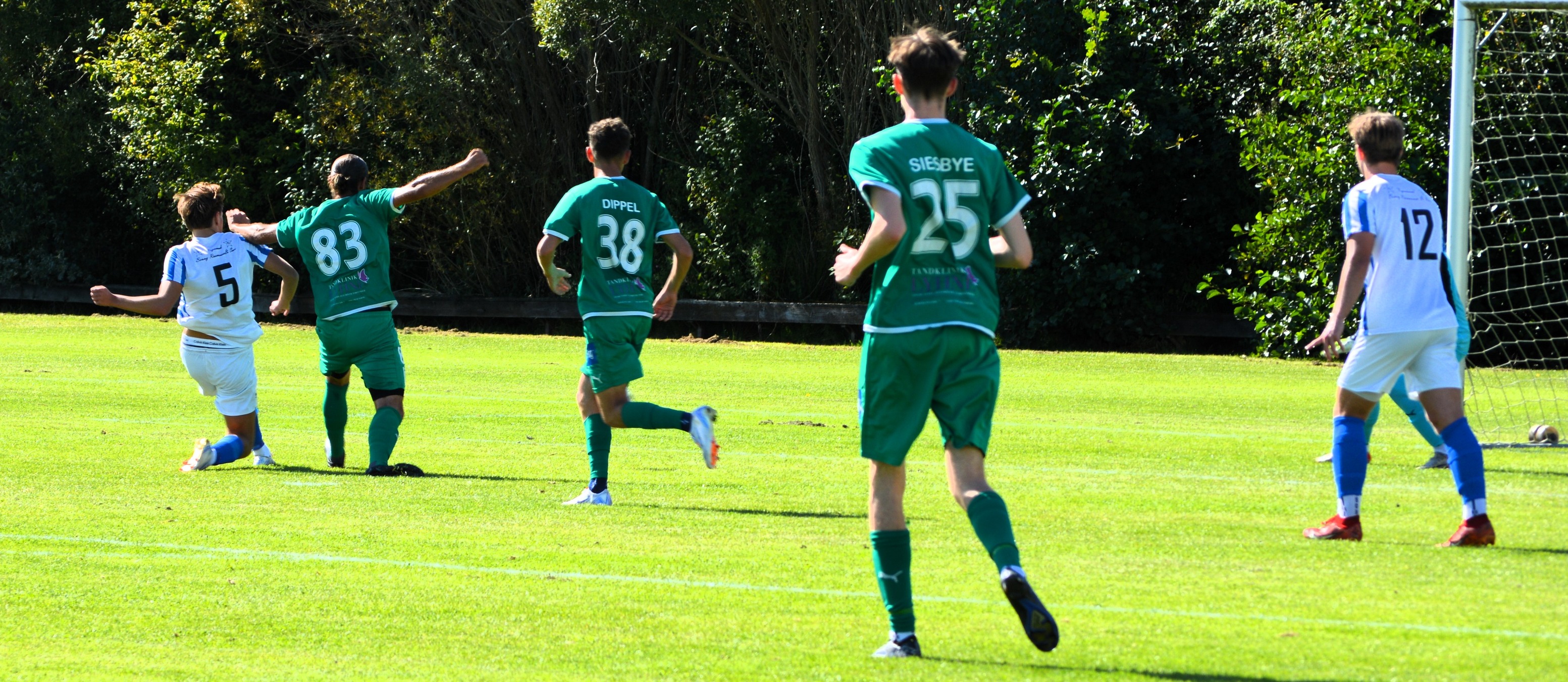 Hornbæk har en lidt bredere trup i denne sæson, så på trods af flere stamspilleres fravær i lørdagens kamp, var der masser af kvalitet på det flotte græstæppe i Hornbæk. Ikke mindst de unge spillere førte sig frem. Således også efter 27 minutter, da hjemmeholdet kom i front. Angrebet startede i højre side hos Elias Dyhl Memborg, og det efterfølgende indlæg kom fra Nilas Ekstrand-Olsen. På midten lod Mads Kok bolden passere til den mere fri navnebror Mads Jung Jørgensen, der kunne gøre arbejdet færdigt med sit venstreben og dermed score sit første mål på førsteholdet i sin fjerde kamp.
