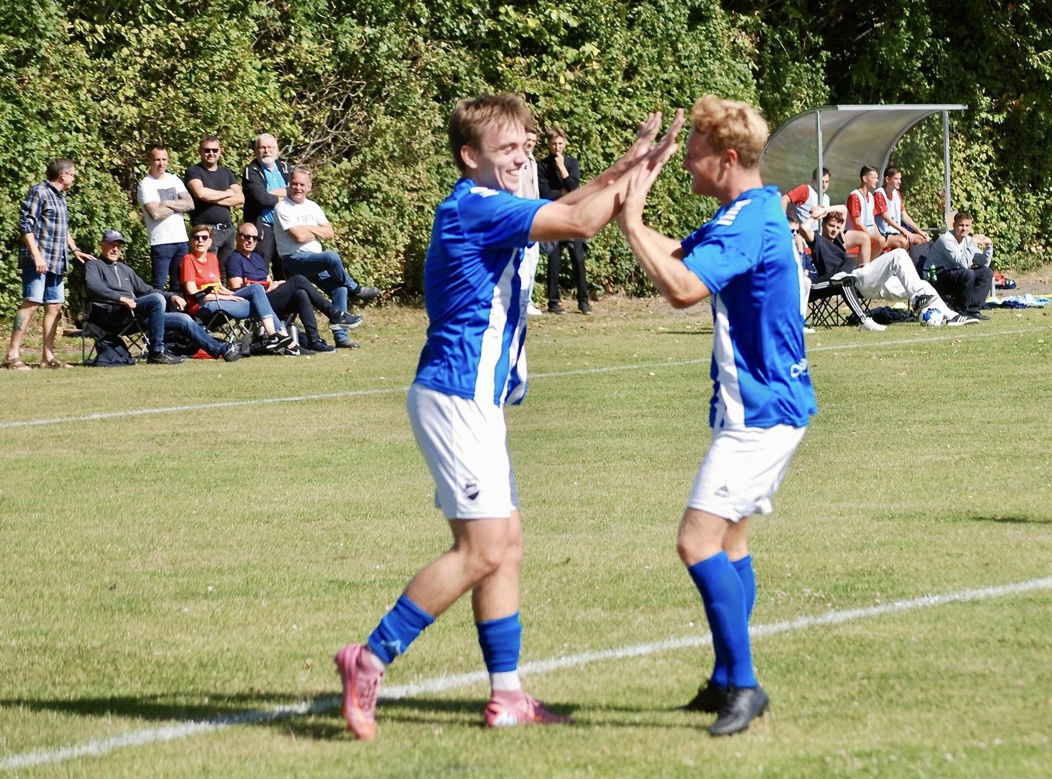 Her har Mads Kok Jørgensen (tv) netop bragt Hornbæk i front med 1-0 og jubler med debutanten Nicolai Dyhl Gleist. Foto: Susanne Prahl.