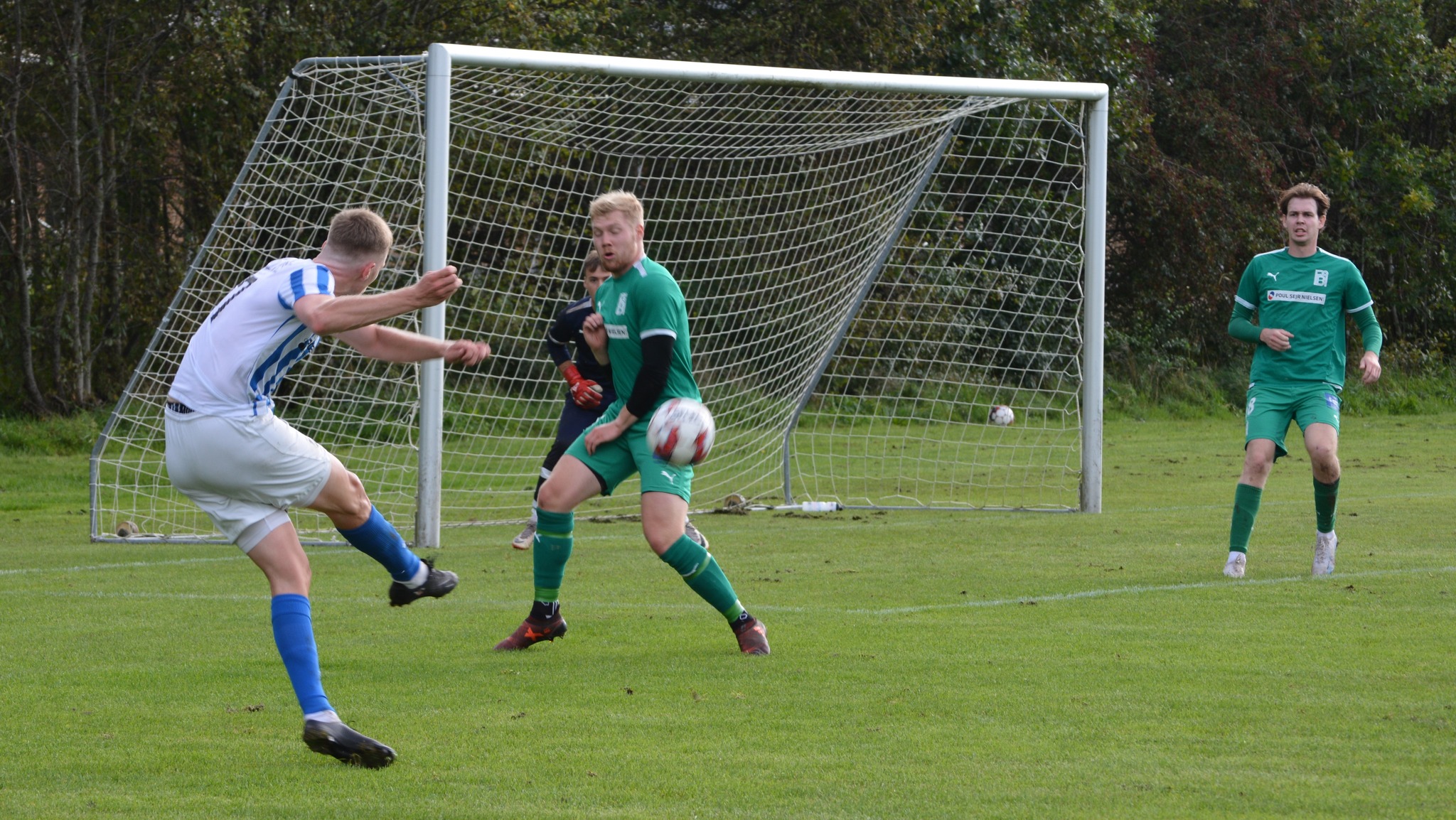 Her sender Oliver Møller bolden i mål til reducering 2-4 for Hornbæk. I det sidste kvarter lykkedes det at få scoret yderligere to gange til slutresultatet 4-4. Foto: Susanne Prahl.