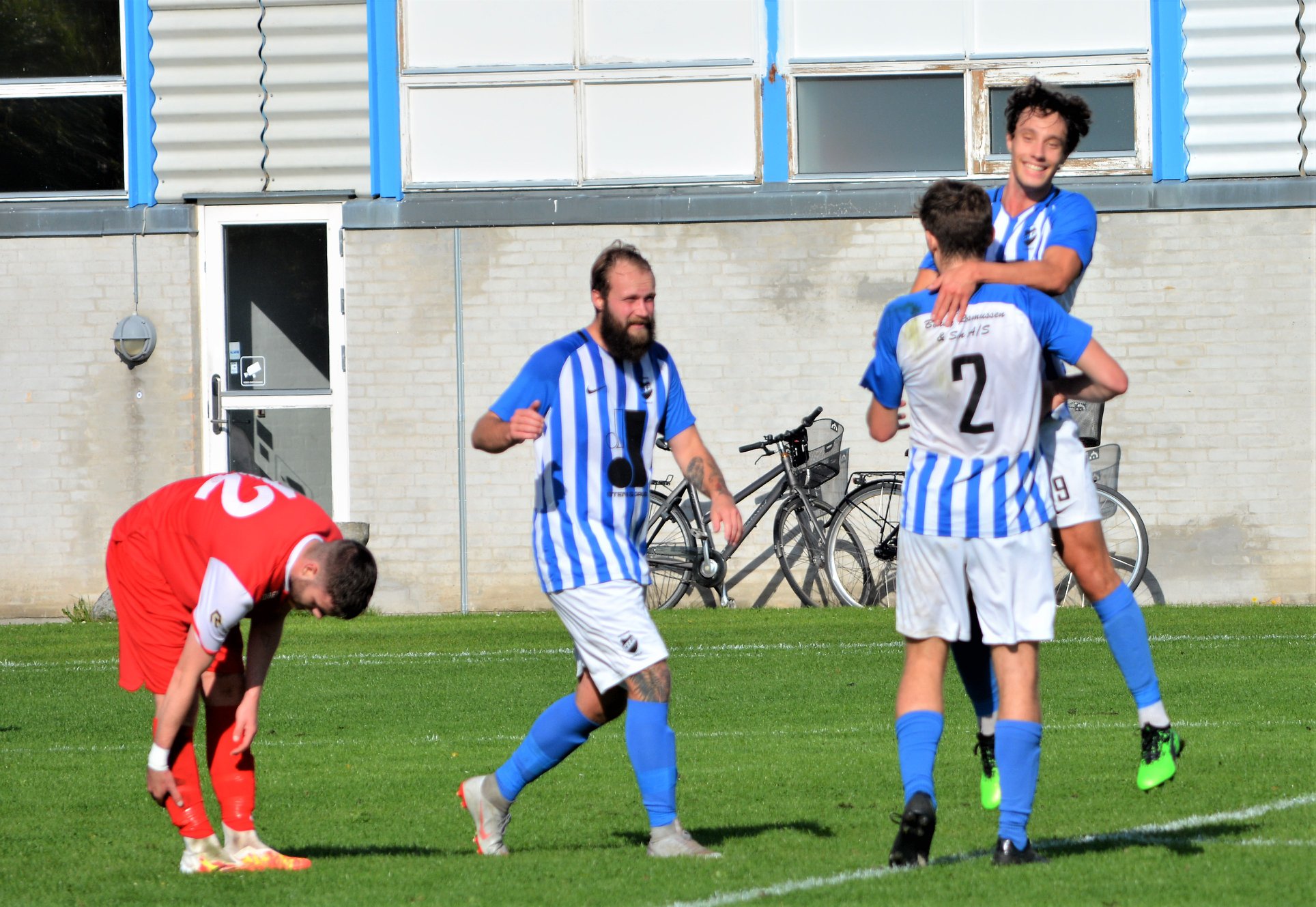 Med ryggen til, målscorer Mikkel Petersen (2), der lige har udlignet til 1-1 på et flot hovedstød. Karl Emil Ellehauge jubler med, og til venstre Nicolai Stevns der et minut senere selv scorede til 2-1. Hornbæk vandt den underholdende kamp med 3-2. Foto: Susanne Prahl.