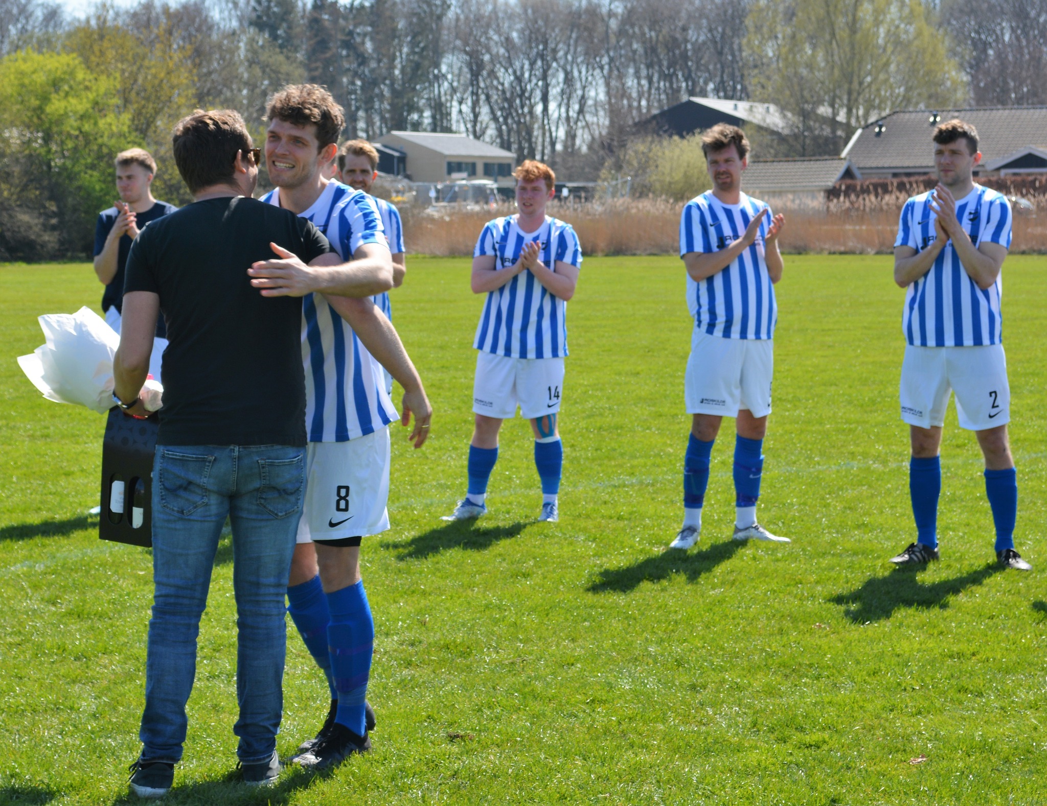 Inden kampen mod Espergærde fik Mikael Juellund-Sørensen vin og blomster for de første 300 kampe på førsteholdet. Foto: Susanne Prahl.