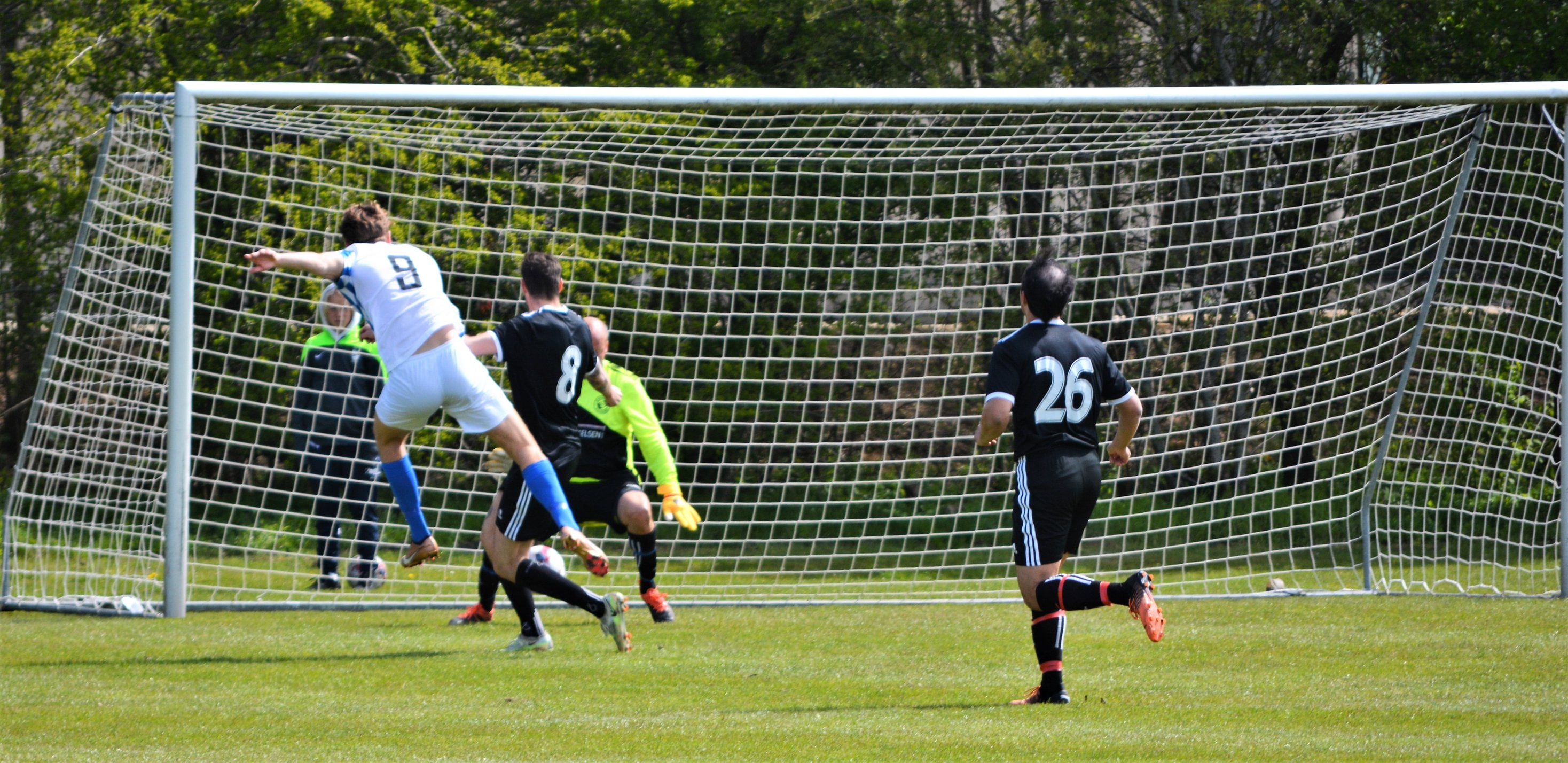 Her indleder topscorer Rasmus Dines (9) målfesten, da han efter blot to minutter afslutter til 1-0 mellem benene på den uheldige keeper. Foto: Susanne Prahl
