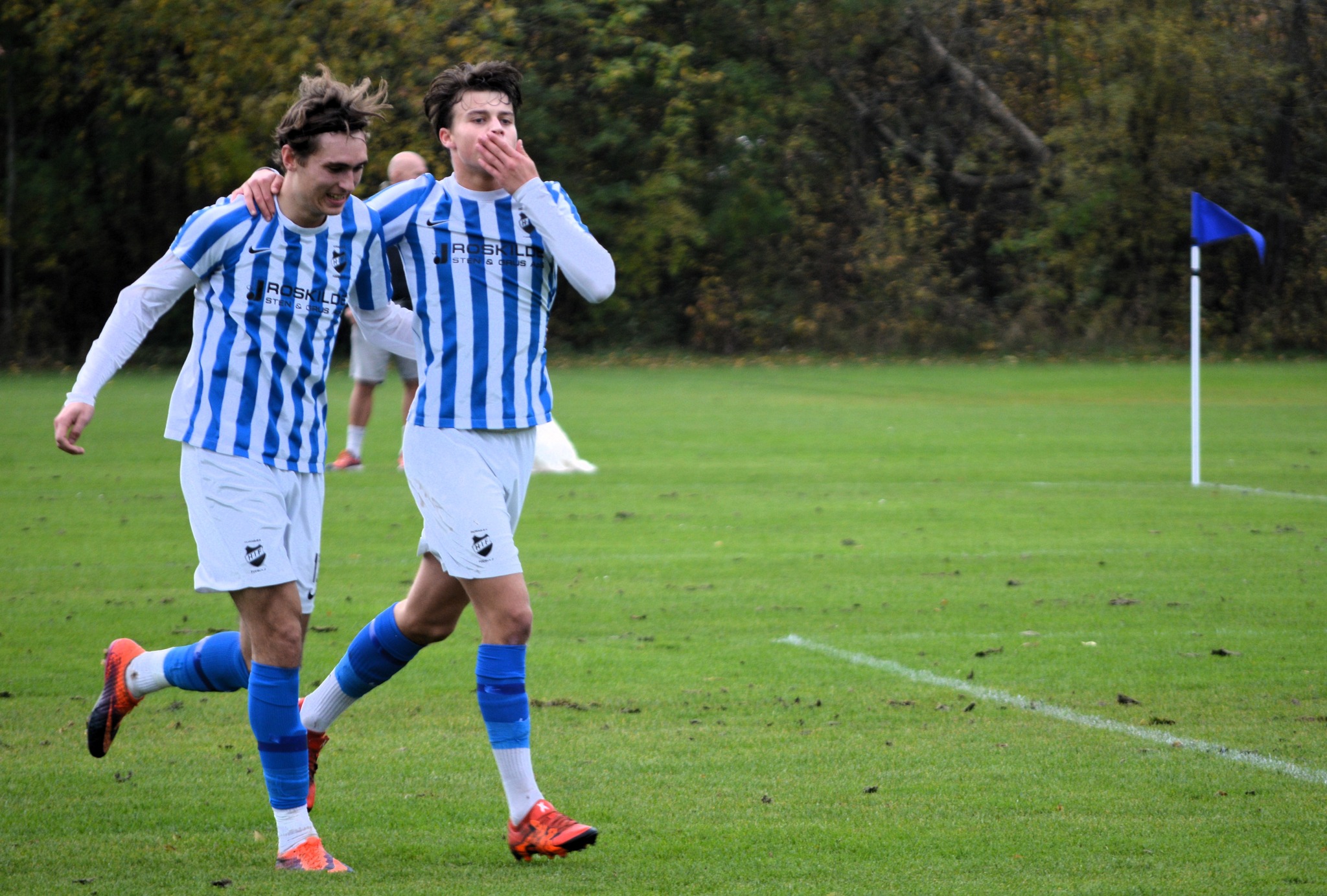 To af Hornbæks mange unge spillere. Elias Dyhl Memborg (tv) og Marius Hesselholt, der fejrer sidstnævntes scoring til 1-0. Foto: Susanne Prahl.