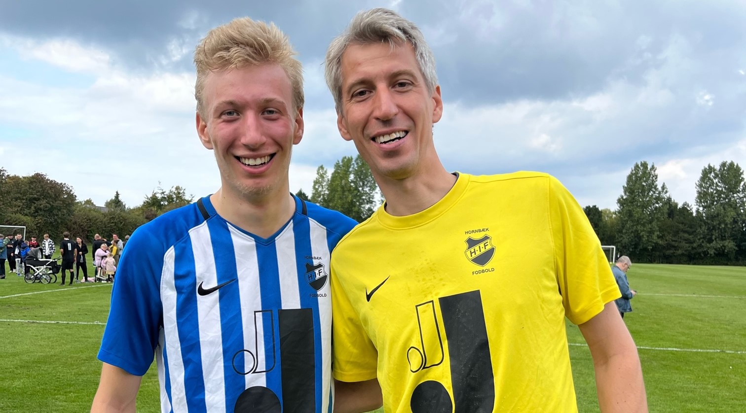 To gange Byskov efter Hornbæks 2-2 kamp i Gilleleje. 45-årige Søren Byskov vikarierede i målet og blev så pludselig holdkammeret med sin 18-årige søn Jonas.