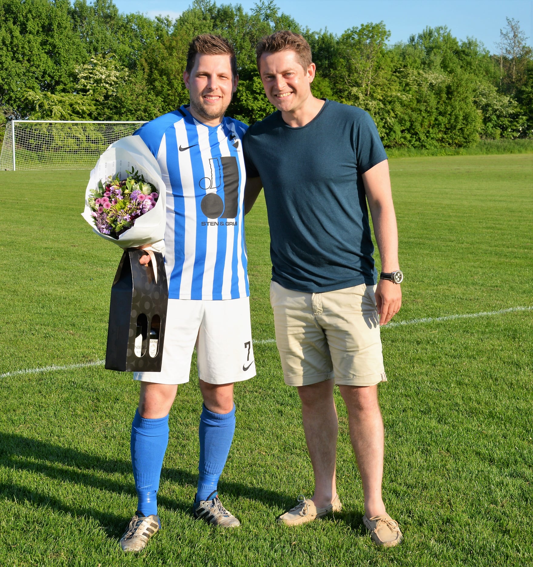 Inden kampen mod Bagsværd blev Shawn Engvej hyldet for at have rundet 300 kampe på Hornbæks bedste hold. Der var blomster og vin fra seniorformand Michael Jørgensen. Foto: Susanne Prahl.