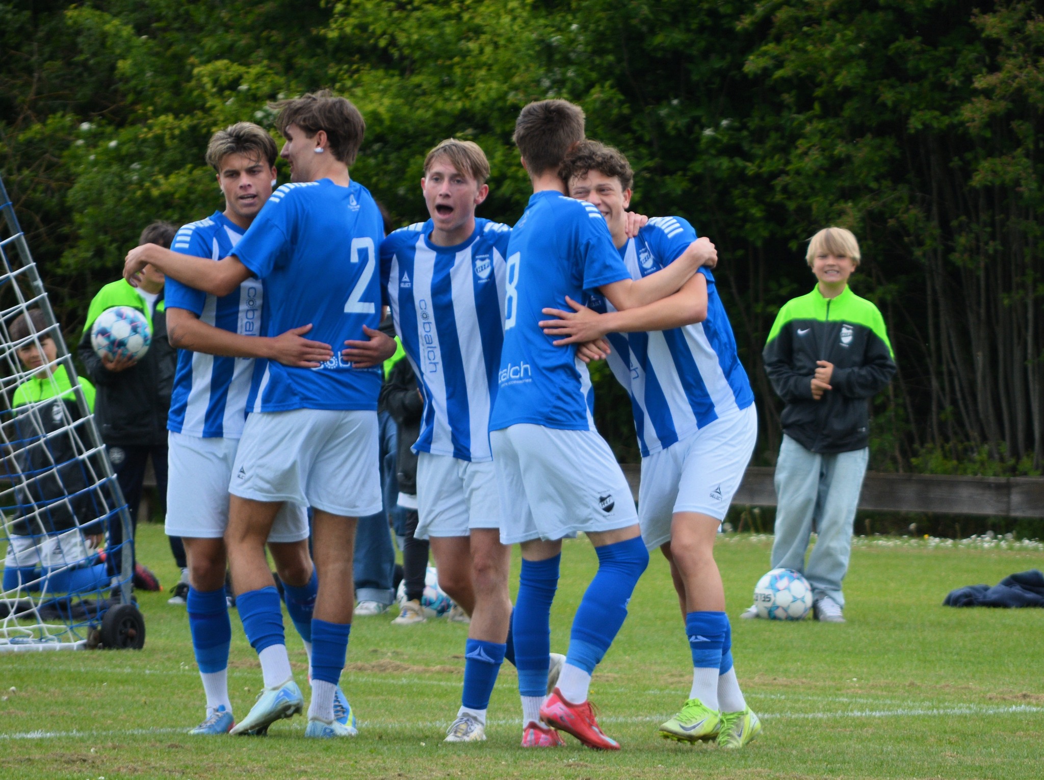 Ung jubel efter Hornbæks første scoring. Yderst tv Marius Hesselholt, der lagde op til målscorer Mingus Hesselholt, yderst til højre. De tre øvrige spillere er fra venstre Elias Dyhl Memborg, Markus Halkjær Juncker og kampens bedste, Carl Fredsted. Foto: Susanne Prahl.