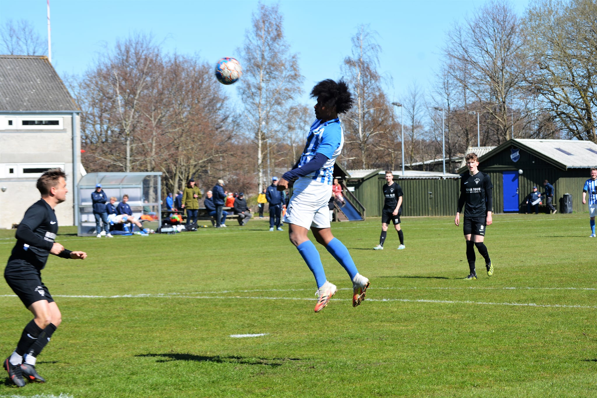 Felix Brun reducerer her til 1-2 for Hornbæk på et flot hovedstød men gæsterne løb med en sikker sejr. Foto: Susanne Prahl.