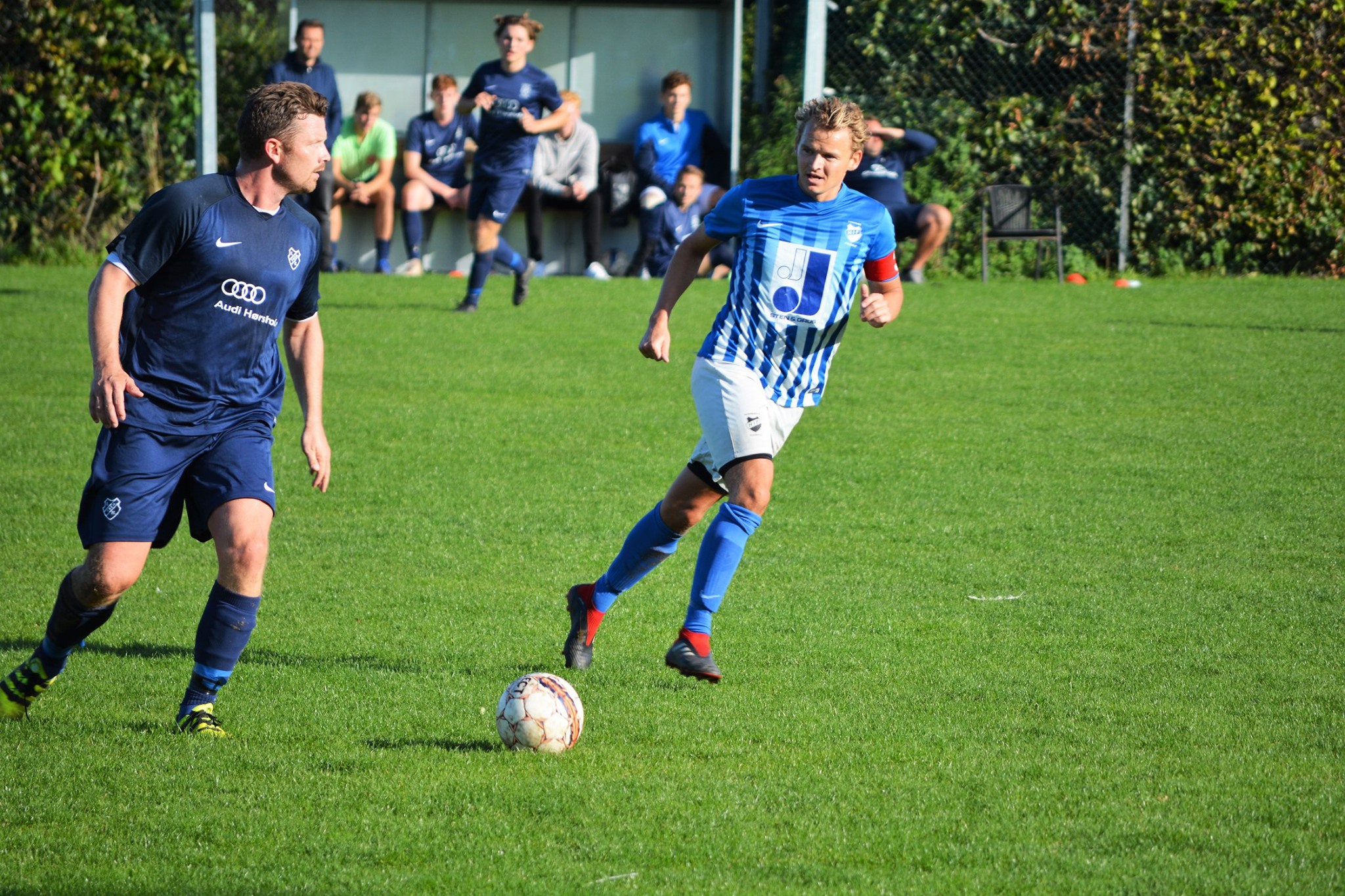 Hellebæks Thomas Guldborg og Hornbæk-anfører Casper Porsgaard scorede henholdsvis en og to gange i lokalopgøret. Foto: Susanne Prahl.