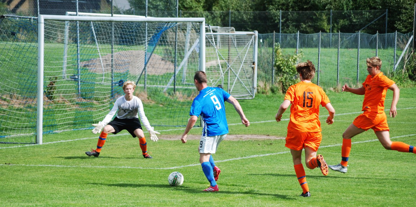 Daniel Ruberg bringer her Hornbæk på 2-0 i Hellebæk. Foto: Susanne Prahl.