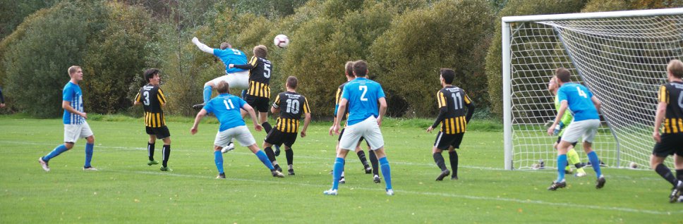 Ruberg når højest og snitter bolden i mål - den første af sine tre scoringer. Hornbæk vandt 5-1 og overtager førstepladsen. Foto: Susanne Prahl.